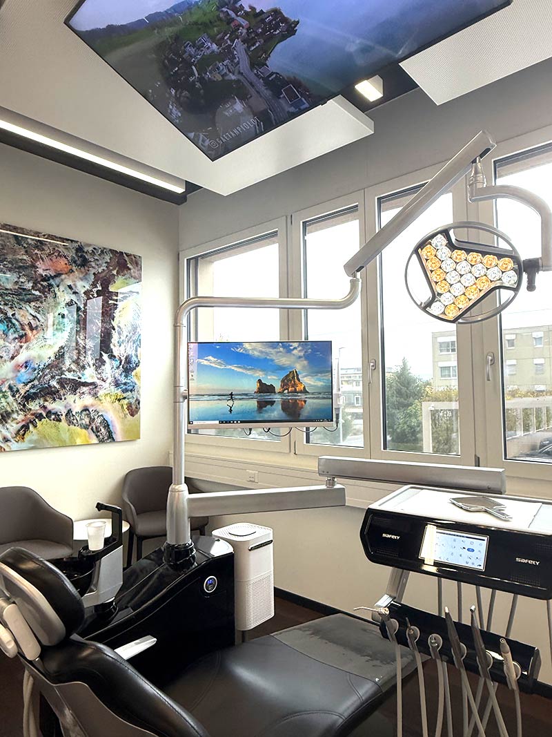 Während der Behandlung können unsere Patienten ganz entspannt bleiben: Sie wählen Musik oder Unterhaltung nach ihren Wünschen und geniessen eine ruhige Atmosphäre in unseren modern ausgestatteten Behandlungsräumen.